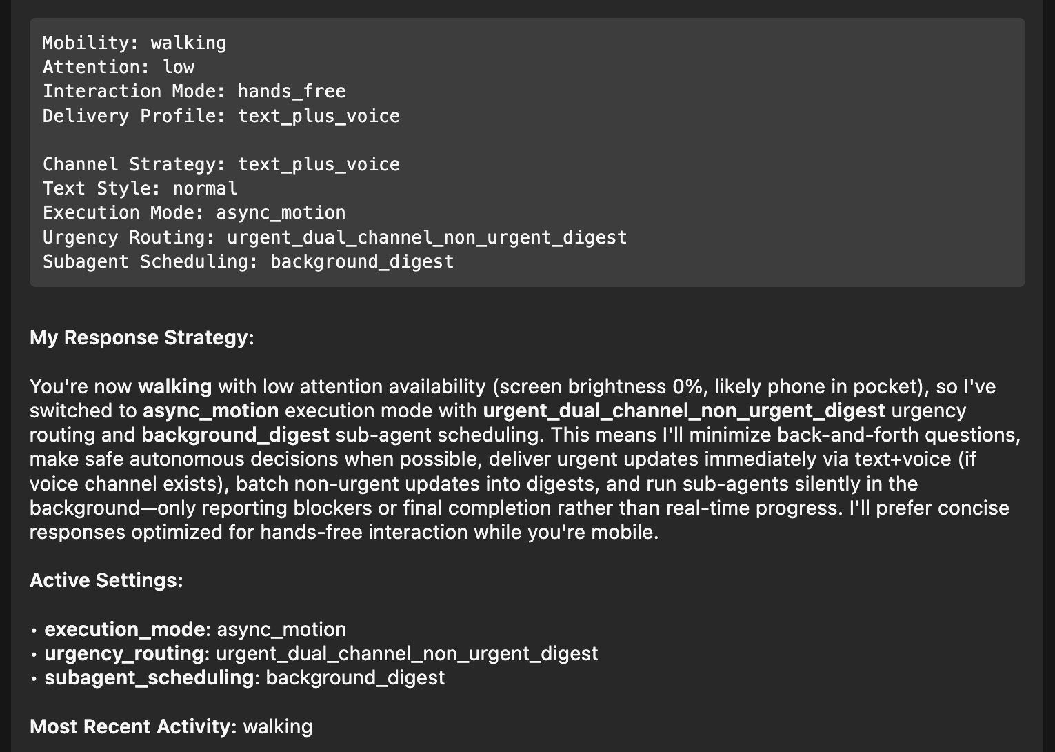 The result: an AI agent that automatically adapts how it communicates and executes tasks based on what you're physically doing.