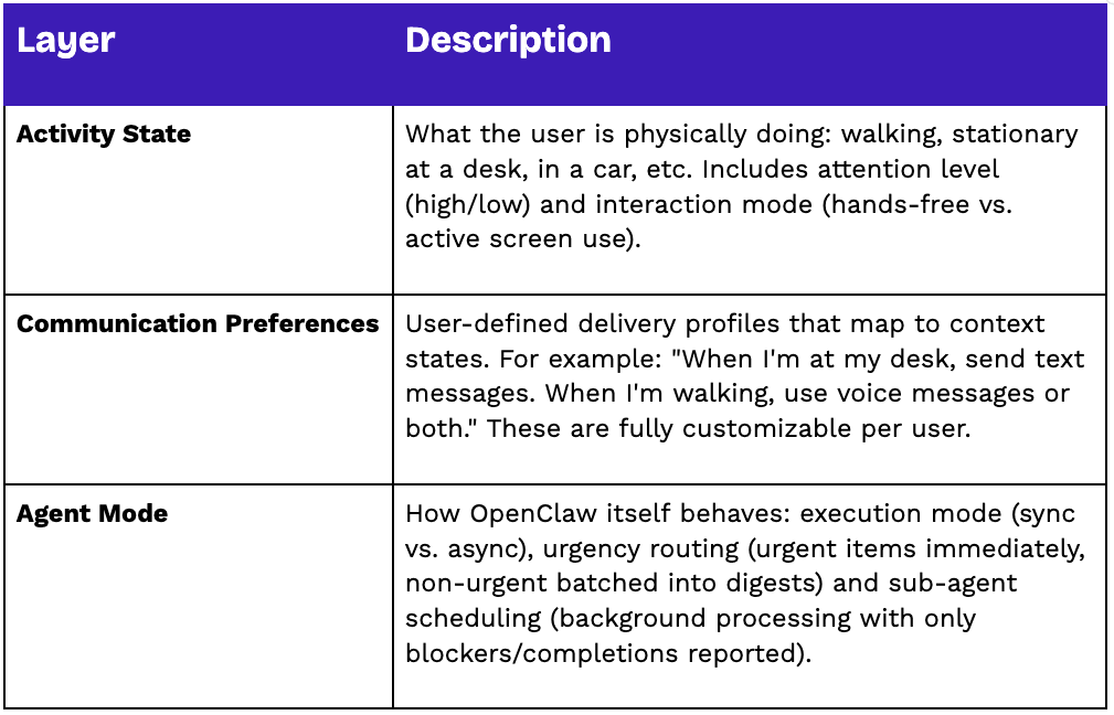 - System Message Injection: On context change, the plugin injects a structured system message into OpenClaw. This message contains the full context profile - activity type, delivery preferences, execution mode and urgency routing rules.